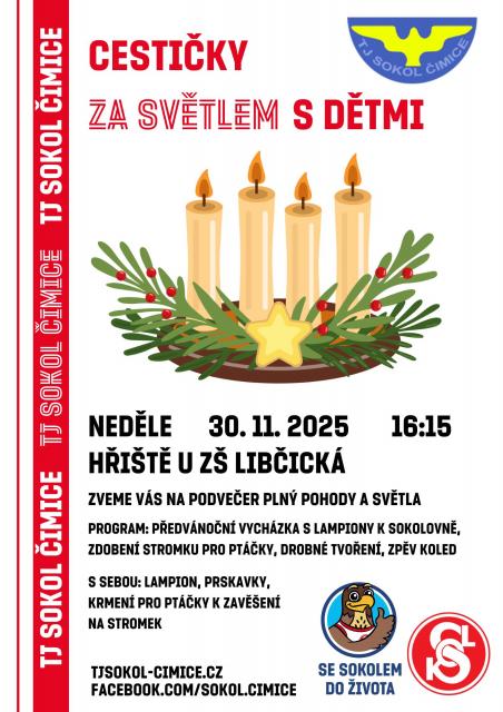zvu vaše děti a vás na podvečer plný pohody a světla. který se uskuteční v neděli 30.11.2022 od 16,15 hod. Sraz na hřišti u ZŠ Libčická, dále tradiční procházka k sokolovně, zdobení stromku, zpívání koled a tvoření s Luckou. S sebou - lampiony, prskavky, krmení pro ptáčky a přezutí. Akce je určena všem oddílům.                                                                                      Věra Smejkalová, náčelnice TJ